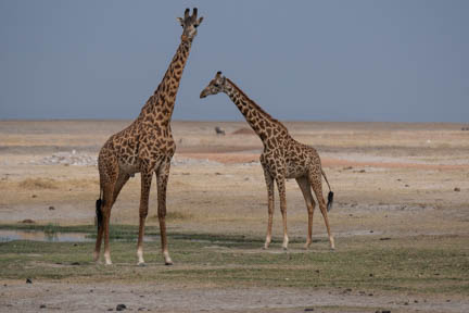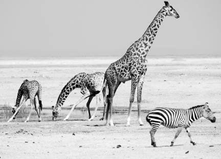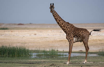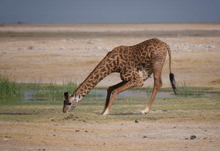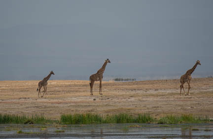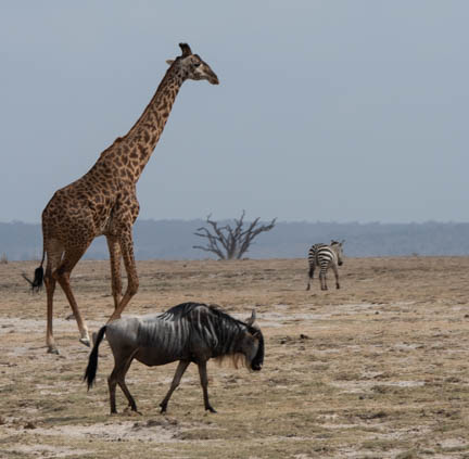 Amboseli is very flat and dry and all of the animals will head to the various water holes for food and water.  We found several giraffes heading for a water hold and stopped to watch them for a while.  They have such long legs that in order to drink water, they have to splay their legs. They were joined at the water hold with some wildebeest and zebras.