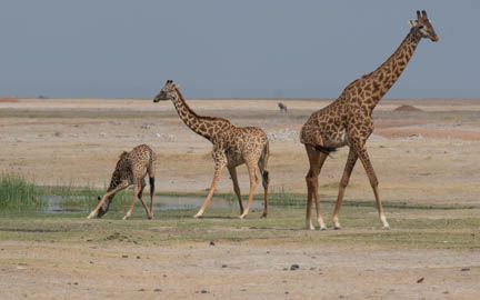Amboseli is very flat and dry and all of the animals will head to the various water holes for food and water.  We found several giraffes heading for a water hold and stopped to watch them for a while.  They have such long legs that in order to drink water, they have to splay their legs. They were joined at the water hold with some wildebeest and zebras.