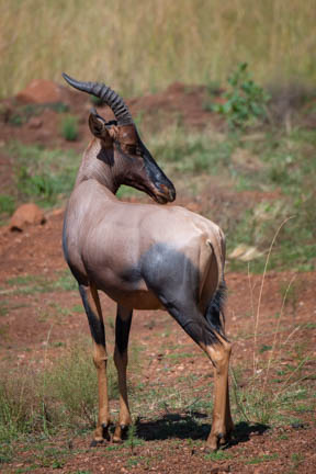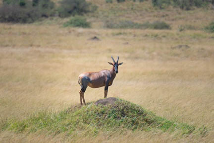 Topi are mediumÂ-sized antelopes with reddish-brown to purplish-red coat. You will often see them standing on top of termite mounds where they can get a better view of any predators.