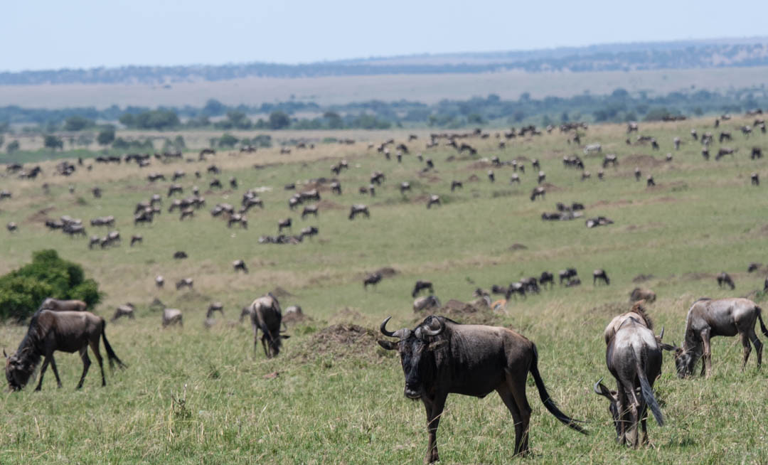 On our way to the Wild-Eye Mara camp, we had to drive by one of the wildebeest crossing points. They were starting to build up on the other side of the river. Every year about 1.5 million wildebeest will travel from Tanzania to Kenya and cross the Mara river for food. It is a treacherous journey for them and filled with danger from predators and crocodiles.