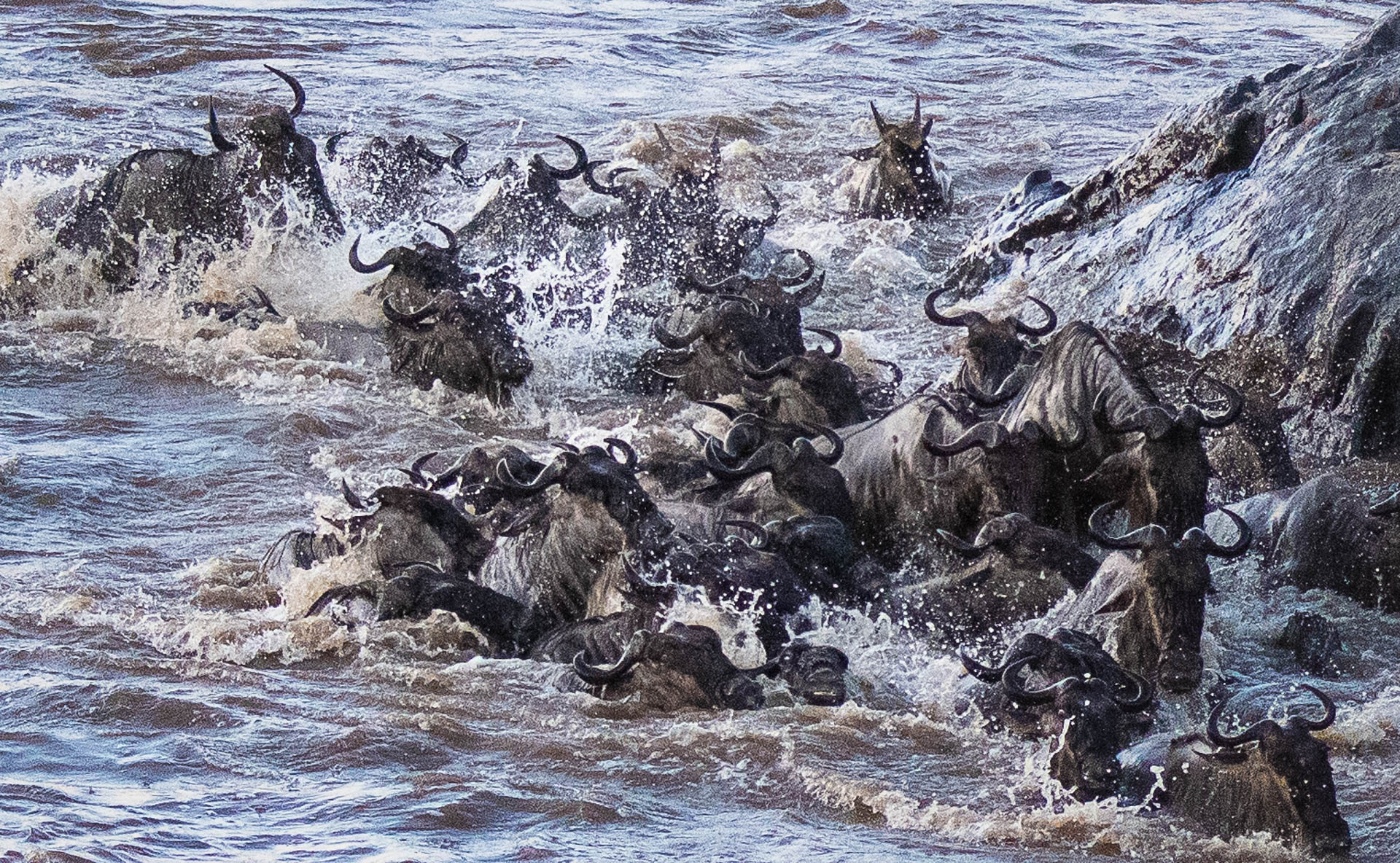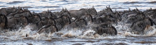 Like before, once one wildebeest starts across, everyone else follows. And this time there is danger lurking in the water – crocodiles.