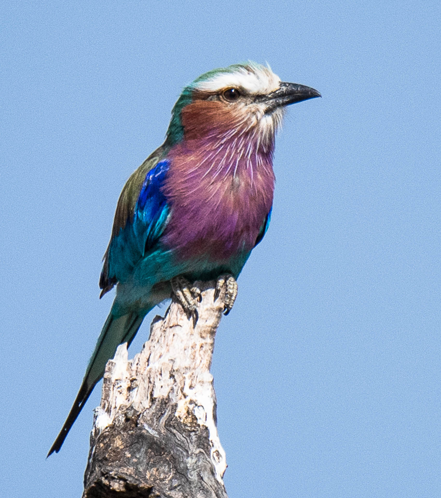 The lilac-breasted roller is the national bird of Kenya and is a common bird on the African savannah. Besides Kenya, it is quite common in Zimbabwe, Botswana, northeastern South Africa, and much of Namibia, excluding the Namib Desert. It is very colorful and actually has 8 different colors – green, white, black, yellow, turquoise, dark blue, reddish brown, and lilac. They are not afraid of humans so you can get fairly close without it flying off.