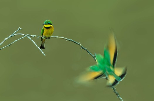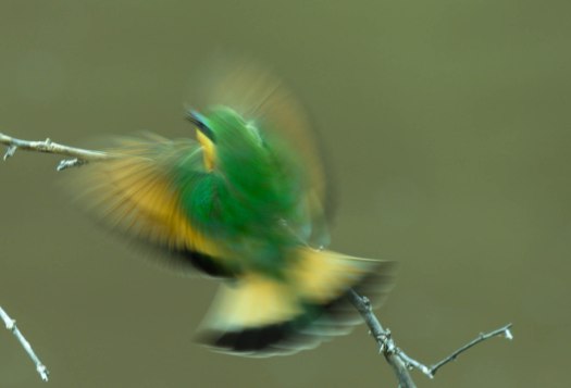 For these photos, we did a little experimenting. I had already gotten some bee-eater photos so we decided to slow the shutter speed to get some blur. But it took two to take these photos.