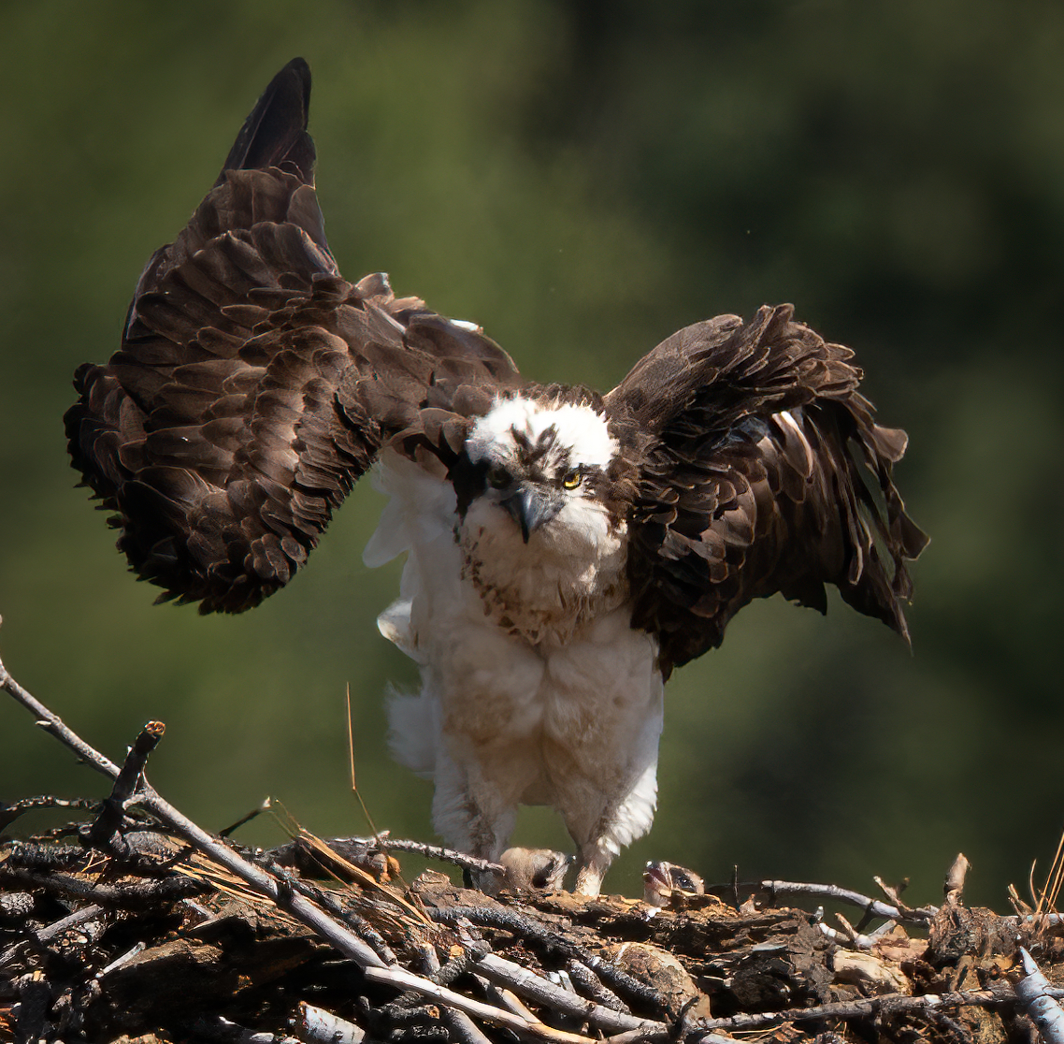 I’m hoping to follow this osprey family and the babies grow up. After sitting on her eggs in the nest for more than a month, the babies were finally born. You can barely see the babies heads at this point. I will continue to watch them grow.