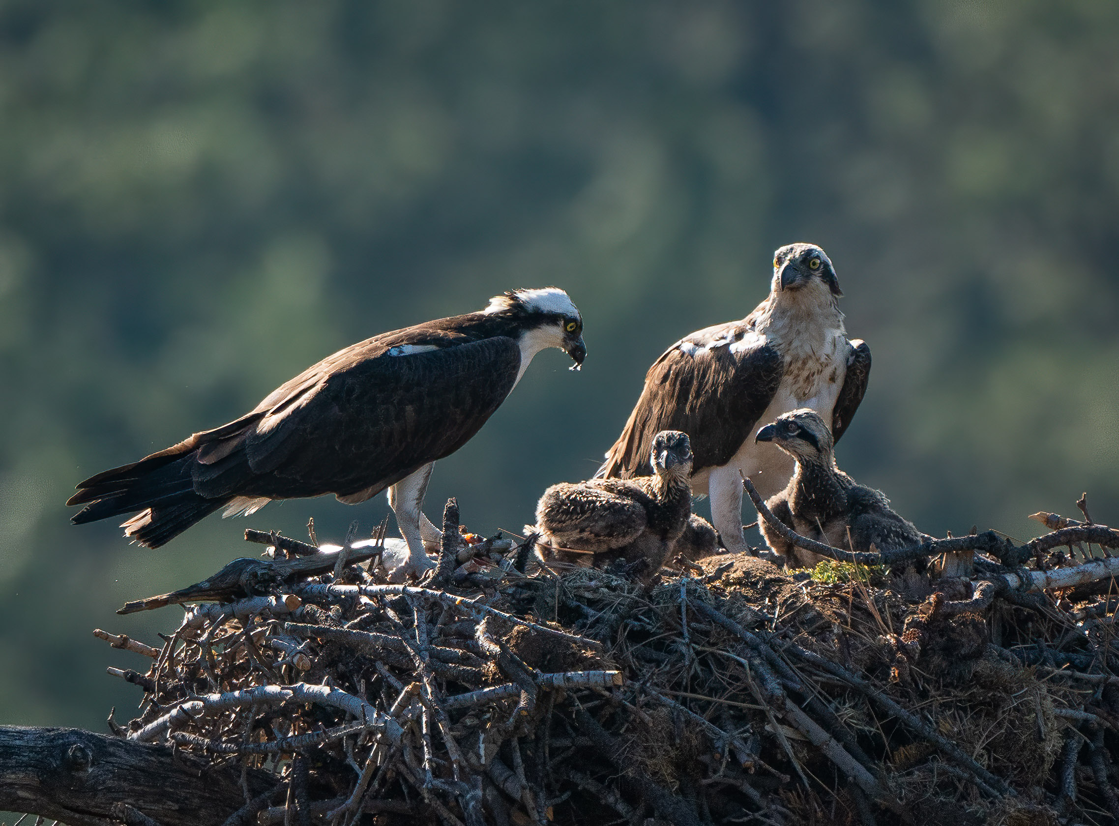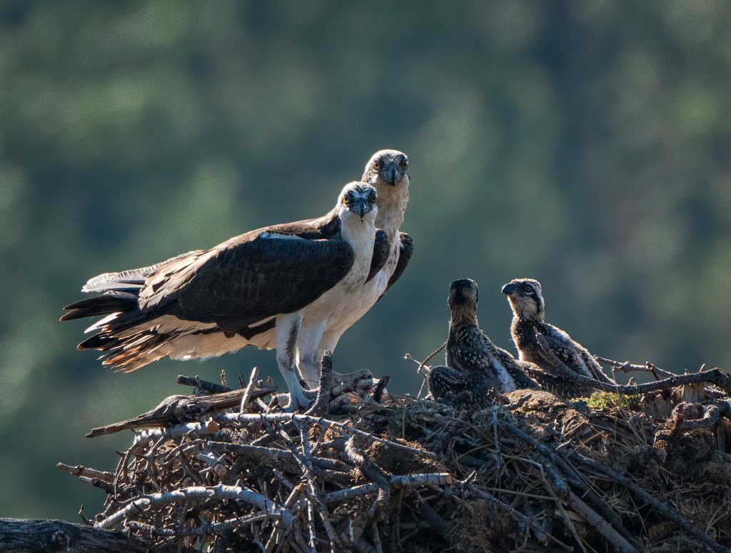 It has been a week since I was up at the osprey nest. During that week we had historically high temperatures (108 degrees) and I was concerned about the welfare of the chicks. Thankfully, the family survived and the babies are continuing to grow.