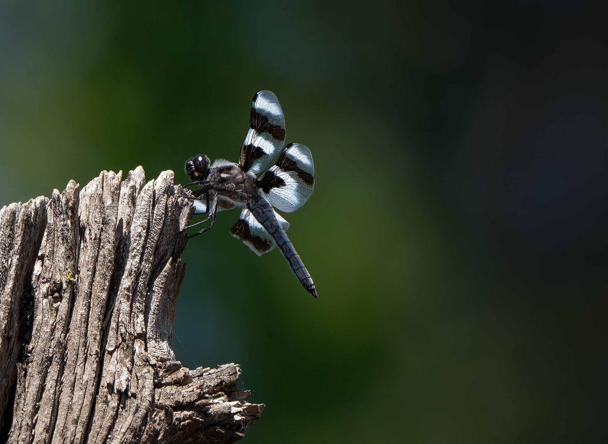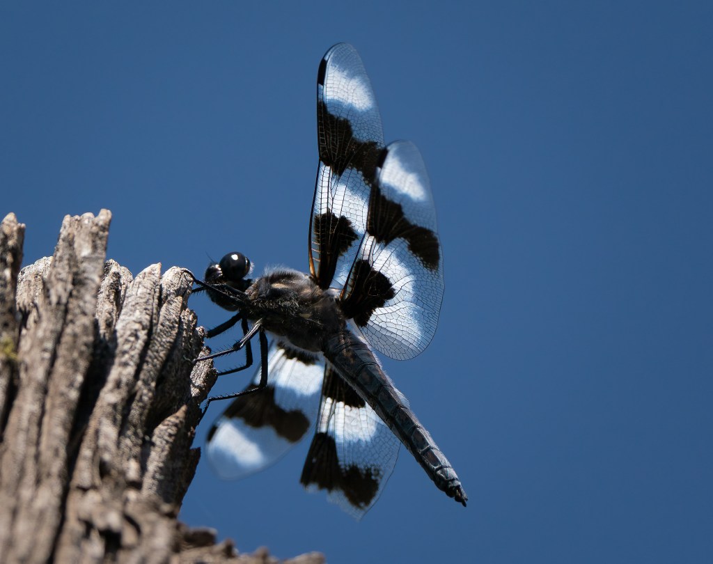 While trying to take photos of some smaller birds in my back yard, this dragonfly flew in. Although they are apparently a common dragonfly in North America, I had never seen one before. It perched on the top of a dead stump and stayed there for quite a while. It didn’t seem to be bothered by me getting closer to it. It is a very striking dragonfly.