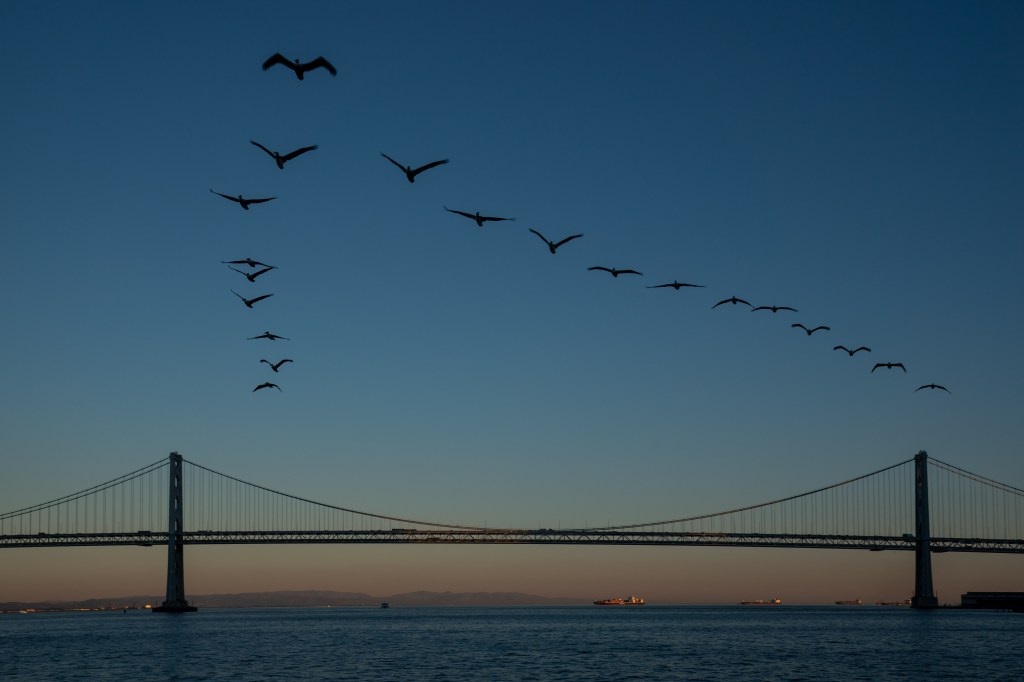 While enjoying sunset at the pier in San Francisco, several pods of pelicans flew by. This particular pod flew right over the Bay Bridge in perfect formation.