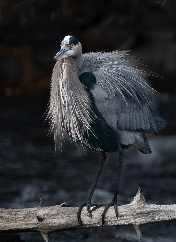 I took this photo a few weeks ago on a cold, blustery day. When I got to the river the heron was standing on a log in the river. It stood there for almost 2 hours before it finally moved. When a gust of wind blew through, I was able to get a few photos of its ruffled feathers.