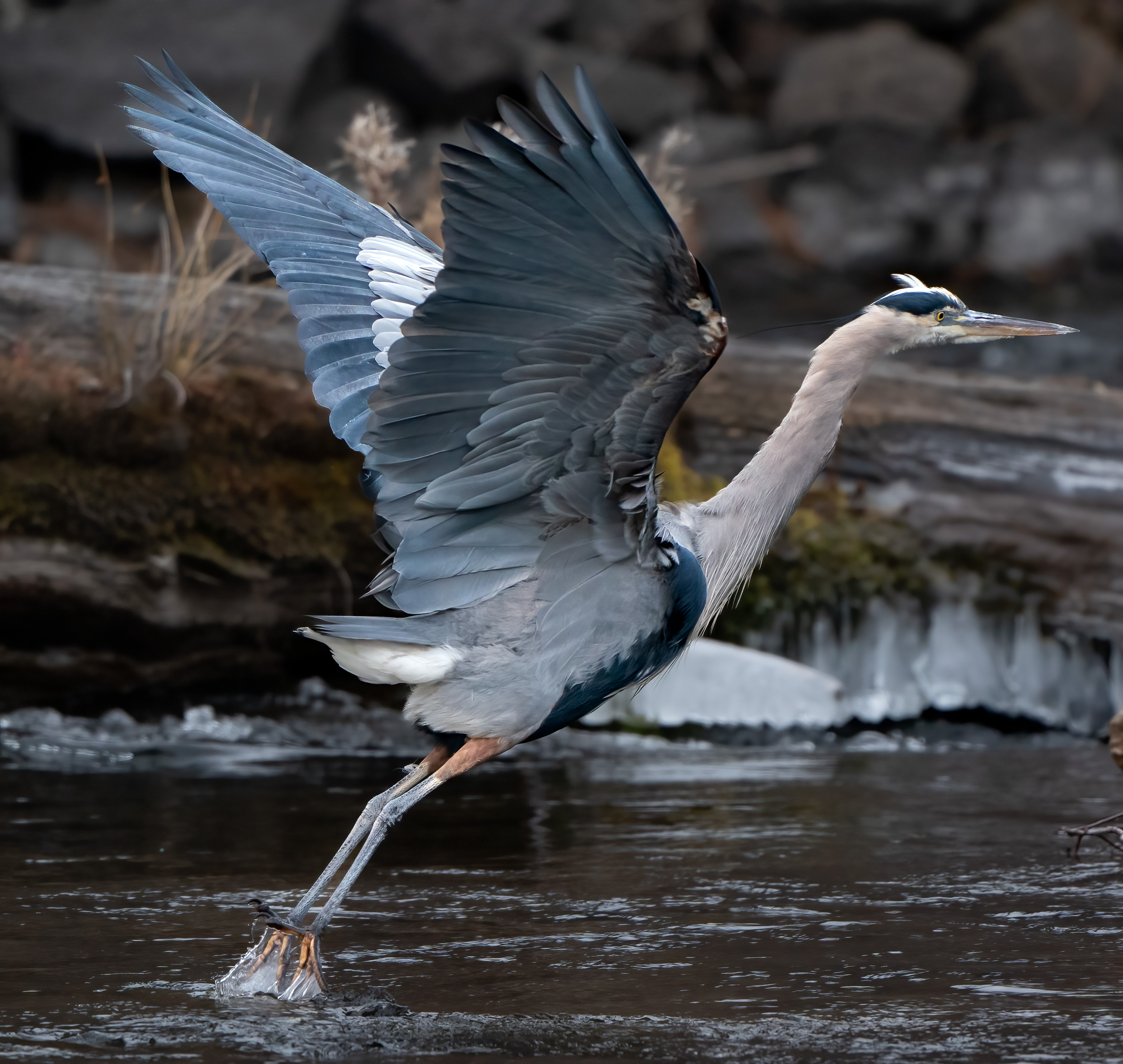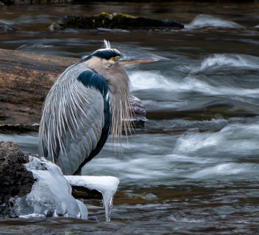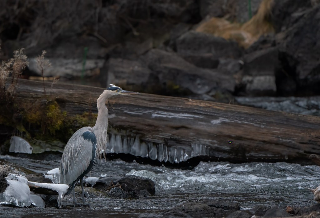 Over the weekend, I went down to the river to hunt down the great blue heron. I didn’t have to go far – it was in one of its regular spots. It was cold and windy, yet it just stood there in the very cold water. You can see how cold it was by the ice on the rocks and logs.
