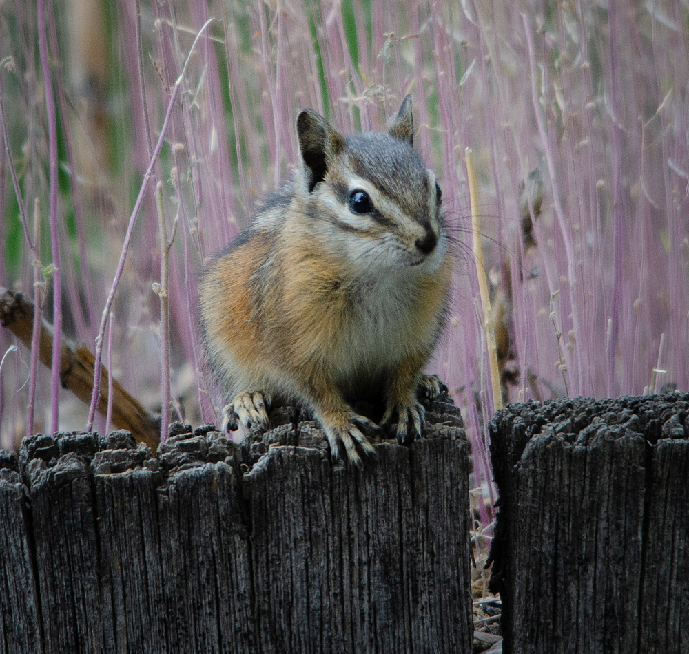This little chipmunk (and its twin) were playing on the wooden planter in front of our office. By the time I got my camera to take the photo, the twin had taken off. They sure are cute little things. Maralee