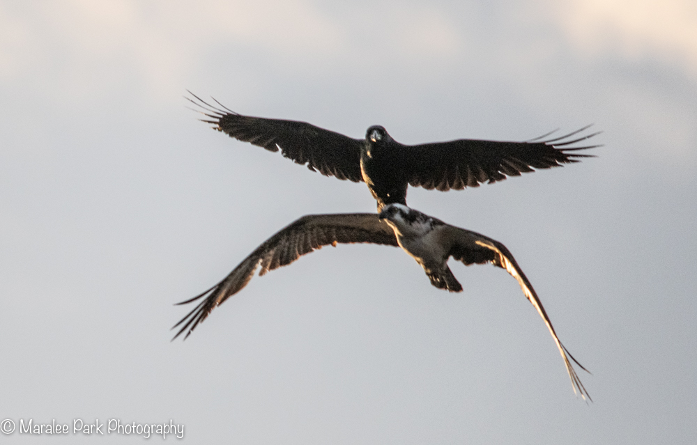 I was watching the osprey fly up and down the river yesterday morning hoping I would see it go fishing. But before it could do that, two ravens started harassing the poor osprey. They chased it up and down the river until it left the area. Maralee